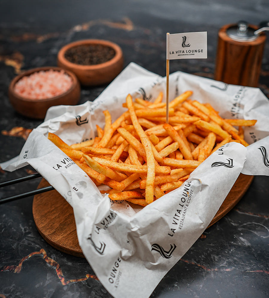 Yufka, patates, akdeniz yeşillikleri, patates kızartması ile.