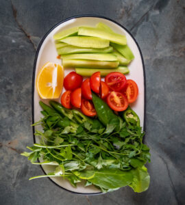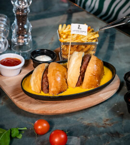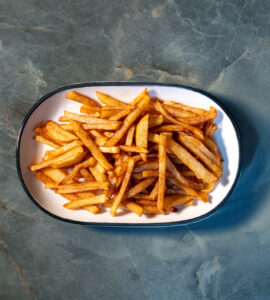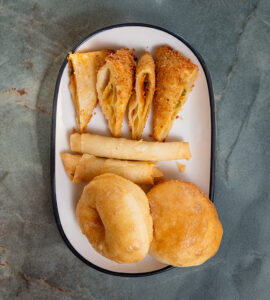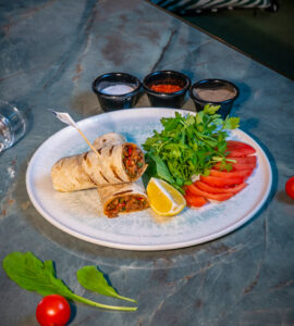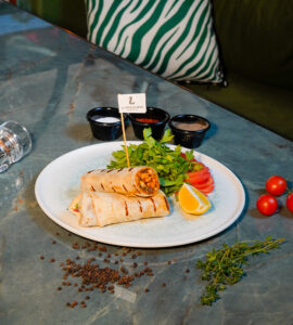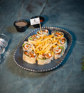 Yufka, kaşar peyniri, akdeniz yeşillikleri, patates kızartması ile.