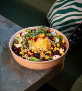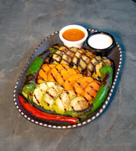 Brokoli, havuç, karnabahar, kapya biber, köy biberi, mısır, soya sos, beşamel sos, kaşar peyniri ile.