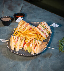 Yumurta, mantar, dana sucuk, dana salam, dana sosis, zeytin dilimleri, kapya biber, köy biberi, kaşar peyniri, patates kızartması, çeri domates, salatalık, akdeniz yeşillikleri ile.