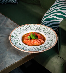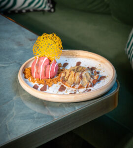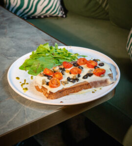 Julyen dana bonfile, kültür mantarı, karamelize soğan, kaşar peyniri, beşamel sos, taze kekik, kapya biber, köy biberi ile.