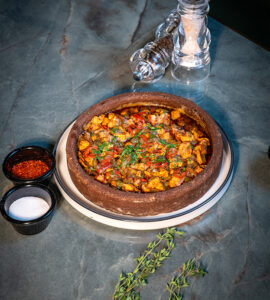 Tavuk parçaları, kültür mantarı, kaşar peyniri, krema, taze kekik, kapya biber, köy biberi, beşamel sos ile.