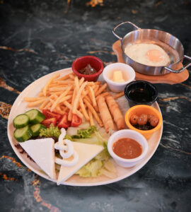 Sahanda yumurta, sigara böreği, patates kızartması, beyaz peynir, kaşar peyniri, burgu peyniri, süt reçeli, çilek reçeli, bal, tereyağı, çikolata, siyah ve yeşil zeytin, domates, salatalık, akdeniz yeşillikleri ile.