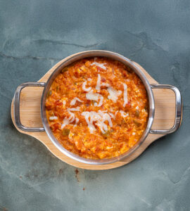 Yumurta, tereyağı, domates, köy biberi, baharatlar ile.