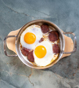 Yumurta, tereyağı, dana kavurma, köy biberi.